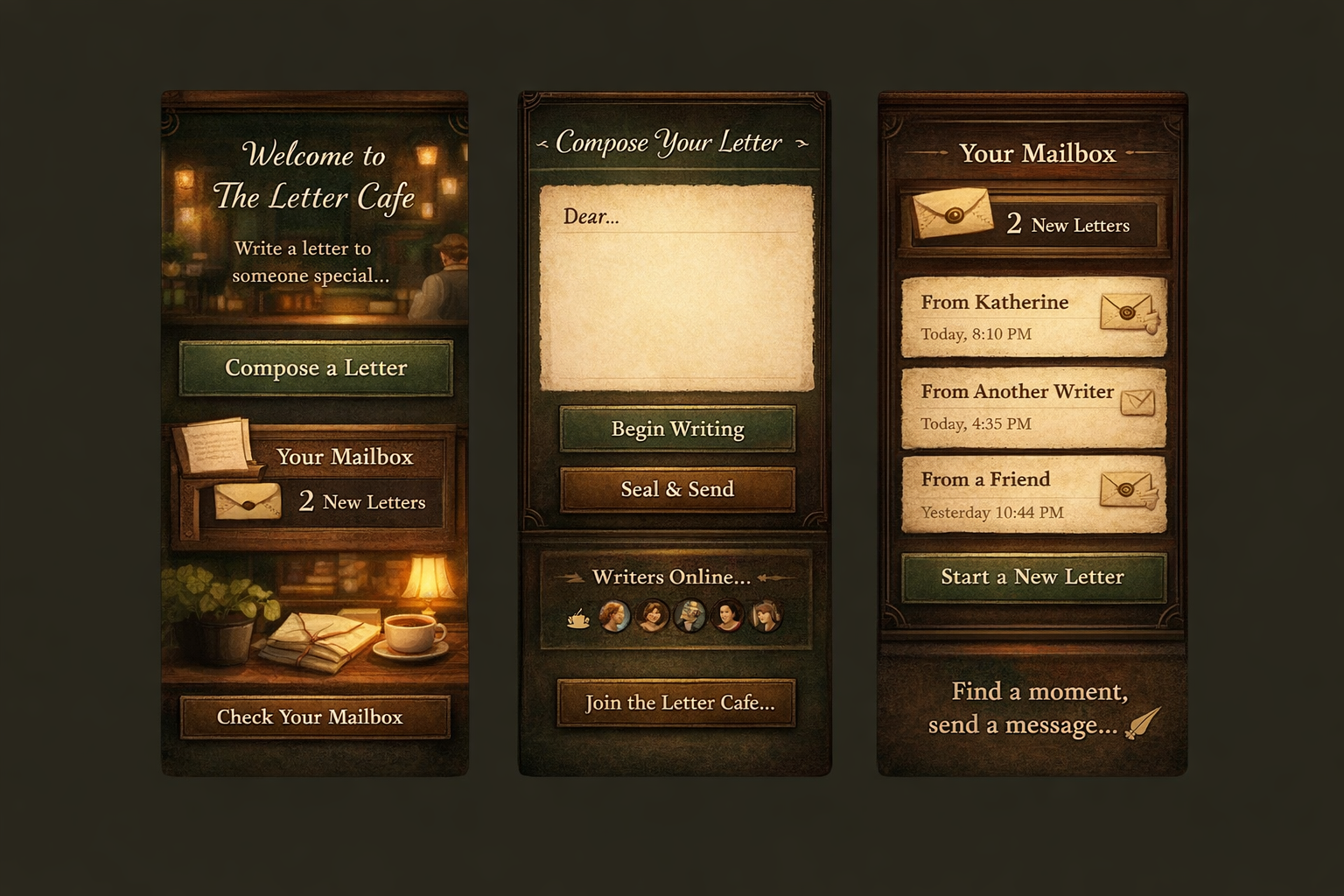 When I had this letter writing idea, I wanted to make an app. There would be a little letter writing desk, and you could decorate your envelopes, and it would be a really cozy vibe, and letters would take maybe a day or two to be ‘delivered’ to your recipient. I even made some concept art with ChatGPT.